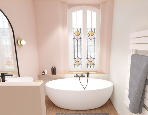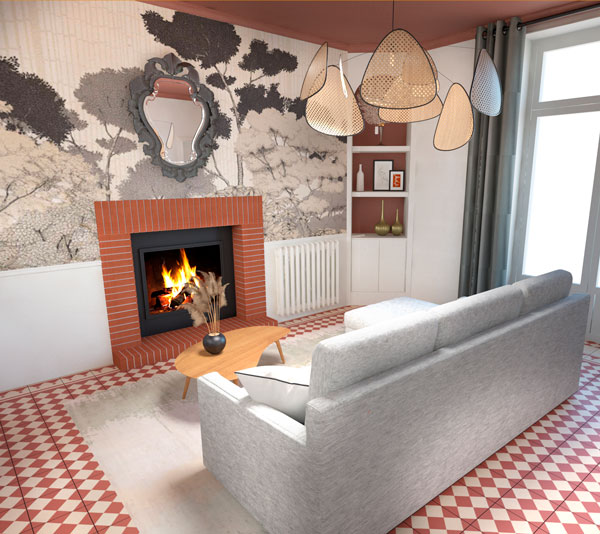 Le parti pris : accentuer le côté « Art Déco » de la maison, par l’ajout de formes géométriques, de motifs et de divers objets de décoration telles que les lampes. Apporter de la douceur et de la poésie : appel au voyage par des papiers peints panoramiques, utilisation de tons pastels et de verts profonds.