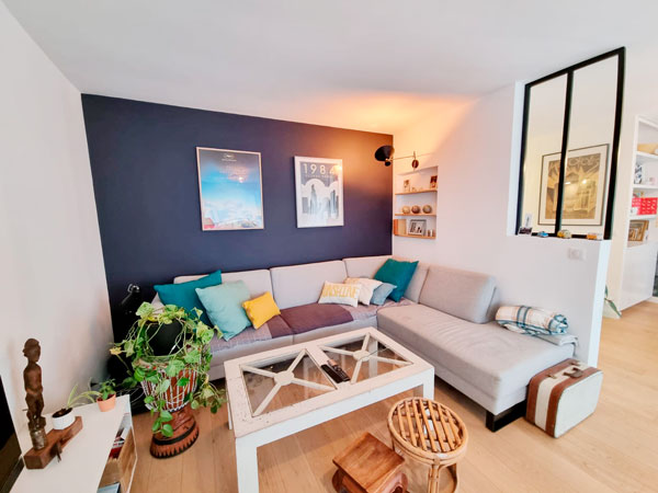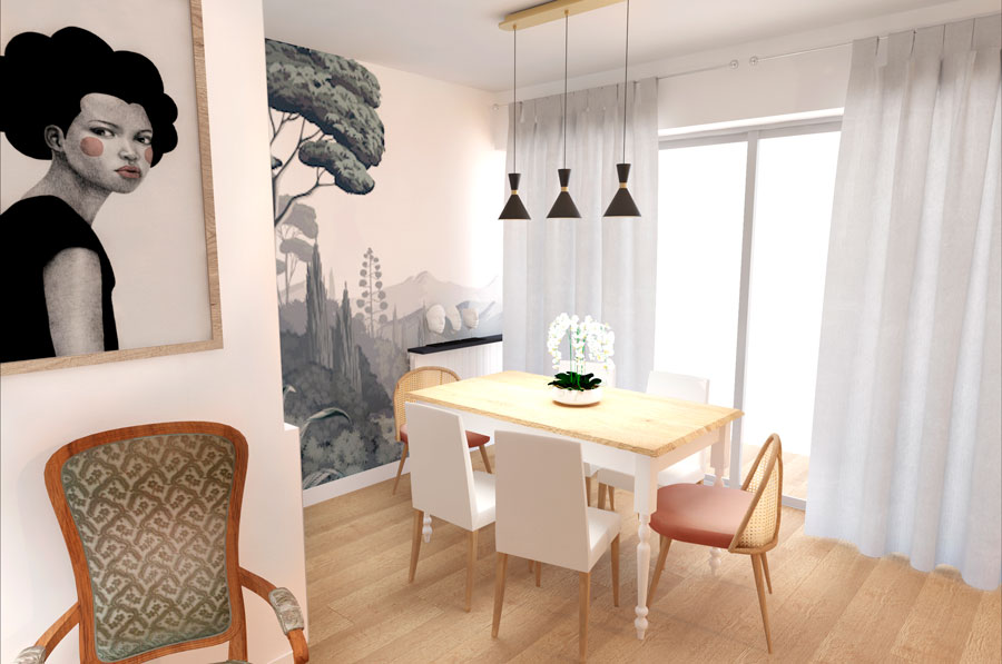 Le parti pris : des couleurs soutenues (vert eucalyptus et charbon dans la cuisine, noir encre dans le salon) pour donner du caractère à l’ensemble. Une décoration mixée : tissu, laiton, bois, métal, rotin… Ajout de verrières pour définir les espaces, et conserver le côté traversant de l’appartement. Un papier peint panoramique « forêt » pour créer un espace repas intimiste et donner de la profondeur à l’ensemble. Donner une large part aux matériaux naturels (sol en chêne massif, agencements bois, rotin…).